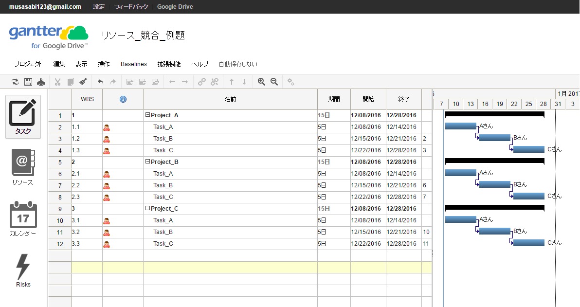 この様に、リソースが競合しても競合を回避してくれる機能というのは無償のプロジェクト管理ツールでは珍しい機能であるといえます。(12/08/2016・現在)