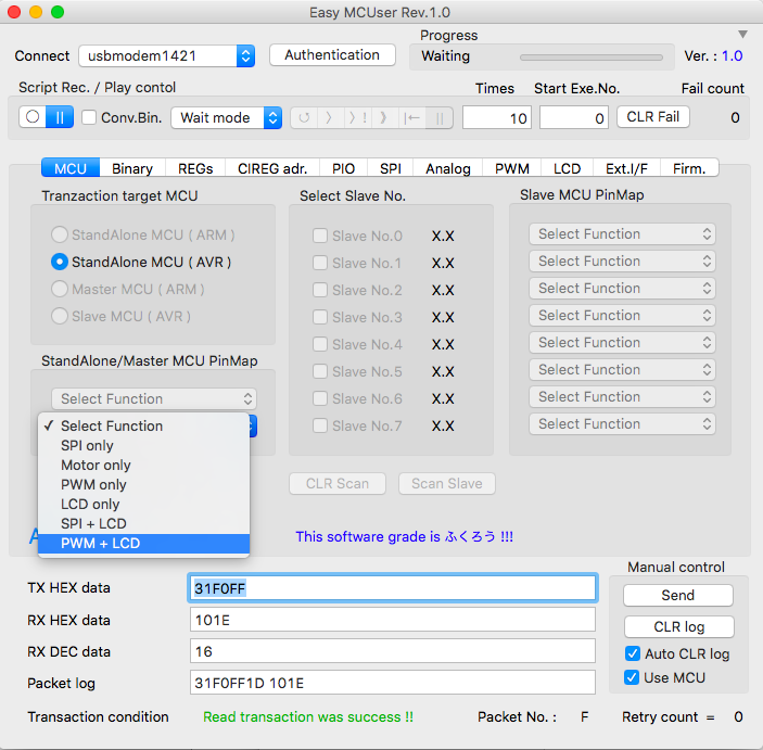 下段のポップアップ・メニューをマウスでクリックすると、以下の様なメニューが表示されます。この中から「PWM + LCD」を選択します。すると、「TX HEX data」の右側のテキスト・エリアに新しい数字が表示されて、その後、「Tranzaction condition」の右側の表示が、「Raad tranzaction was success !!」になってたら、Easy MCUserから仮想MCUに対してのピン機能の設定が成功した事を示しています。