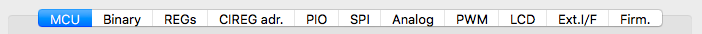Easy MCUser を立ち上げると、最初に「MCU」タブ・パネルが選択された状態となります。「MCU」タブ・パネル以外にも「Binary」,「Regs」,「CIREG adr.」,「PIO」,「SPI」,「Analog」,「PWM」,「LCD」,「Firm.」があります。ここからは、仮想MCUの機能として簡単にGIUから操作が出来る様に用意された、各タブ・パネルの持つ機能とその使い方を説明致します。